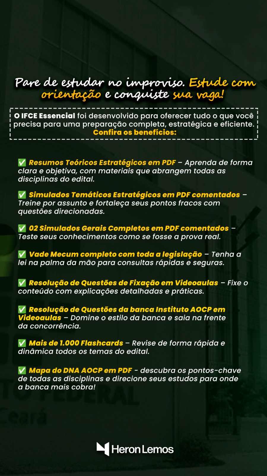 Chegou o curso que vai te conduzir de forma clara, prática e eficiente rumo à sua aprovação: IFCE Essencial – Teoria e Questões.